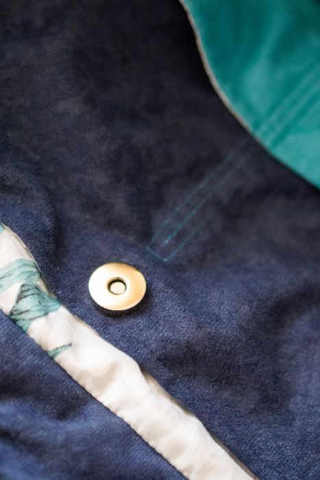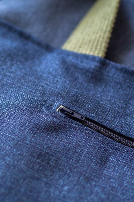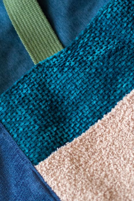 Torba uszyta jest z tkanin w kolorze granatowym, turkusowym i pudroworóżowym.