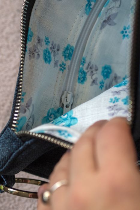 Małe zaszewki na dnie. Z tyłu oraz w środku torebki kieszonki zapinane na suwak. Środek wykończony białą bawełnianą podszewką.