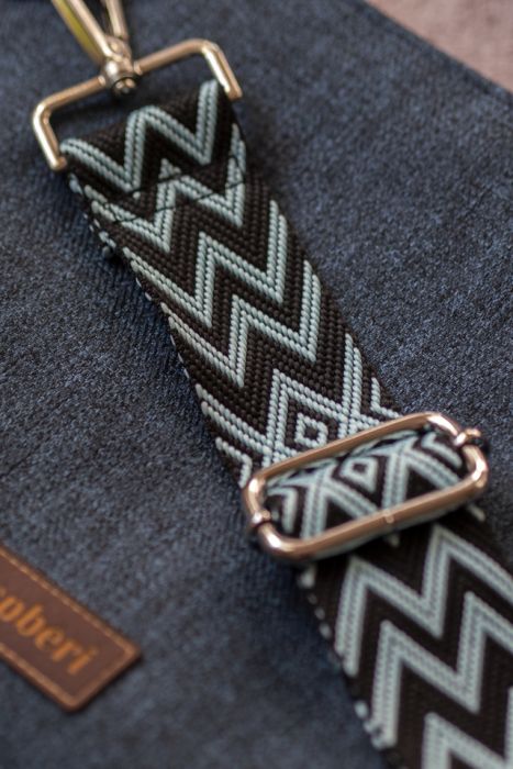 Torebka posiada regulowany, niebiesko-czarny pasek w zygzaki i srebrne okucia.