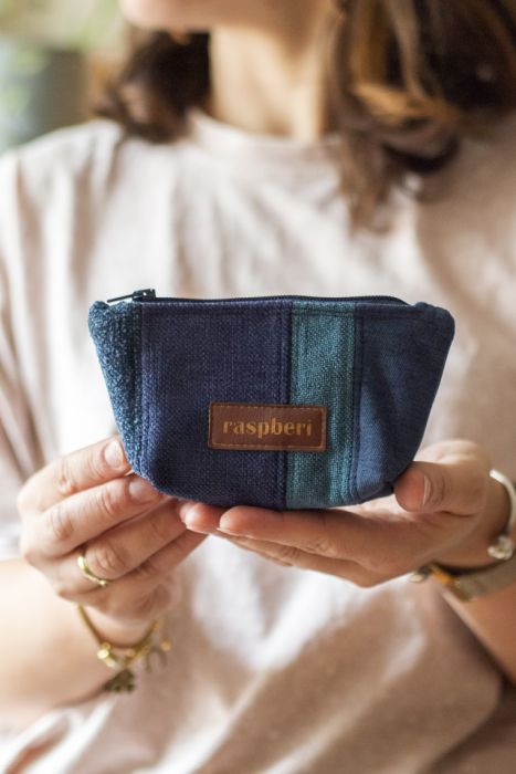 Kosmetyczka w rozmiarze MINI wykonana z kilku granatowych tkanin.