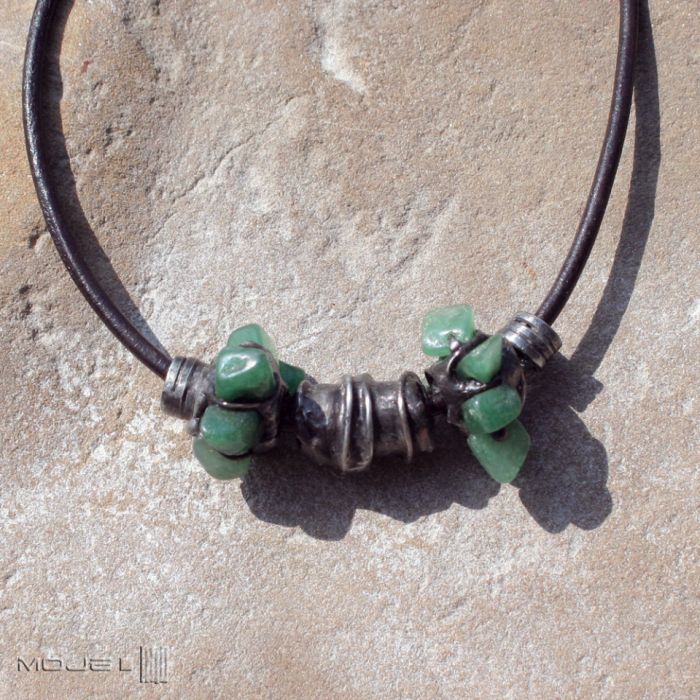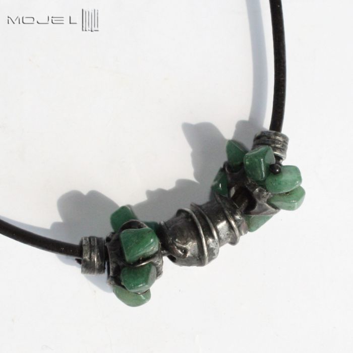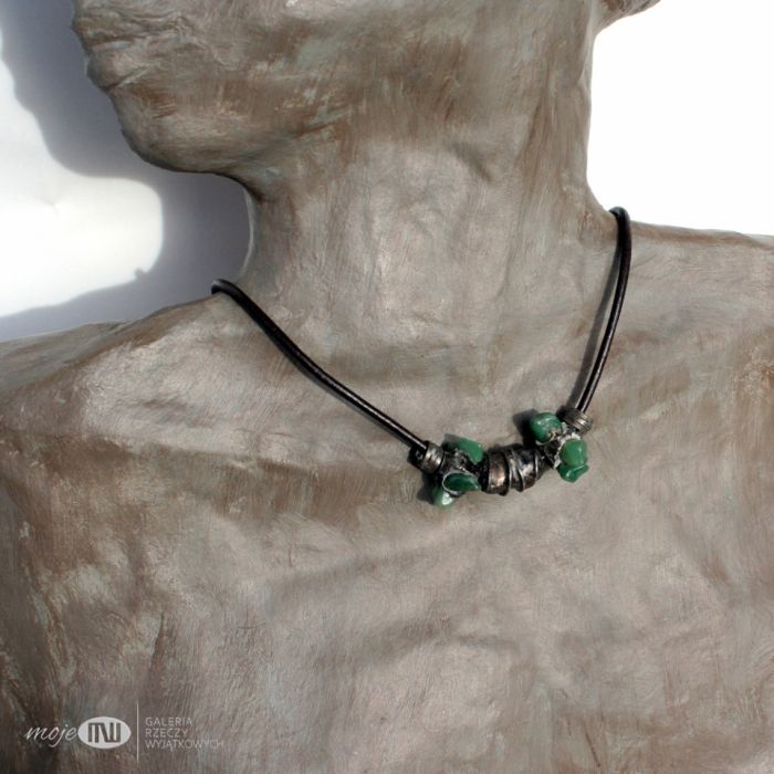 Naszyjnik z zielonych kamyczków awenturynu i ręcznie formowanej miedzi. Miedź pokryta jest cyną i patynowana. Całość zawieszona jest na ciemnobrązowym skórzanym rzemieniu o grubości ok. 3,5 mm.