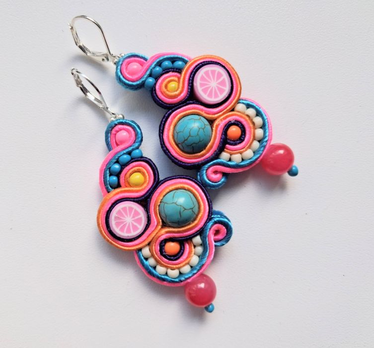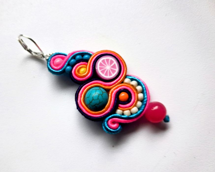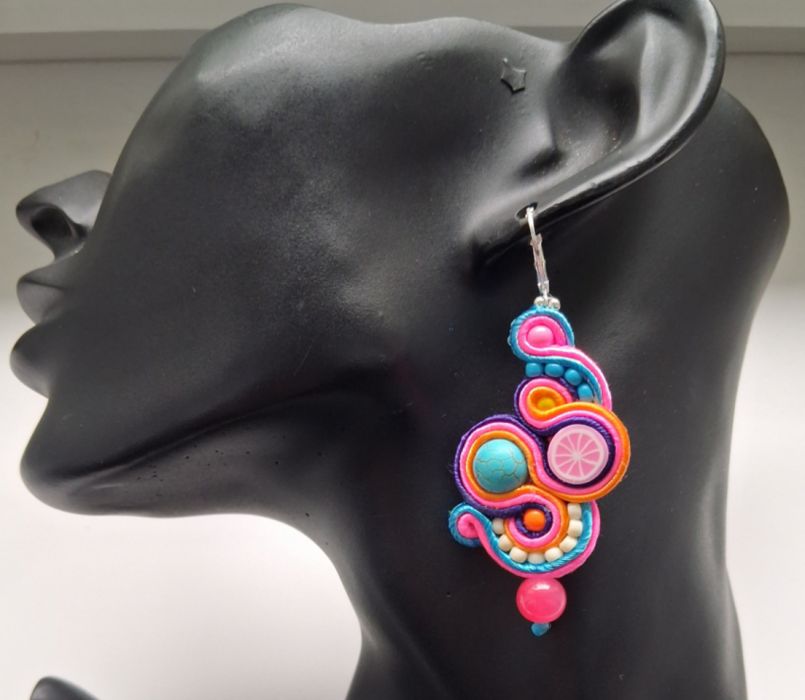 Materiał tych kolczyków: sutasz, fimo, szkło, koraliki Japan Toho