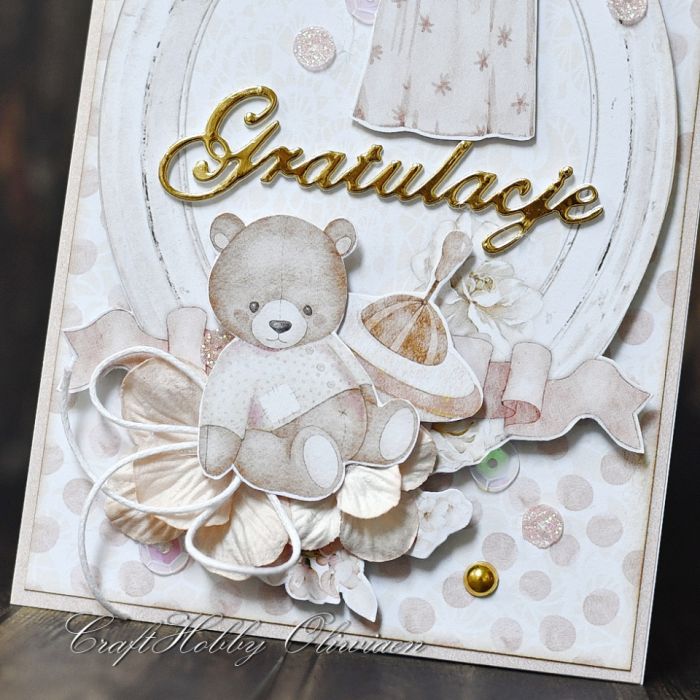 Kartka wykonana z bezkwasowych papierów do scrapbookingu, ozdobiona motywami wycinanymi z papieru, hortensjami mulberry, sznureczkiem, złotymi perełkami i brokatowymi cekinami.