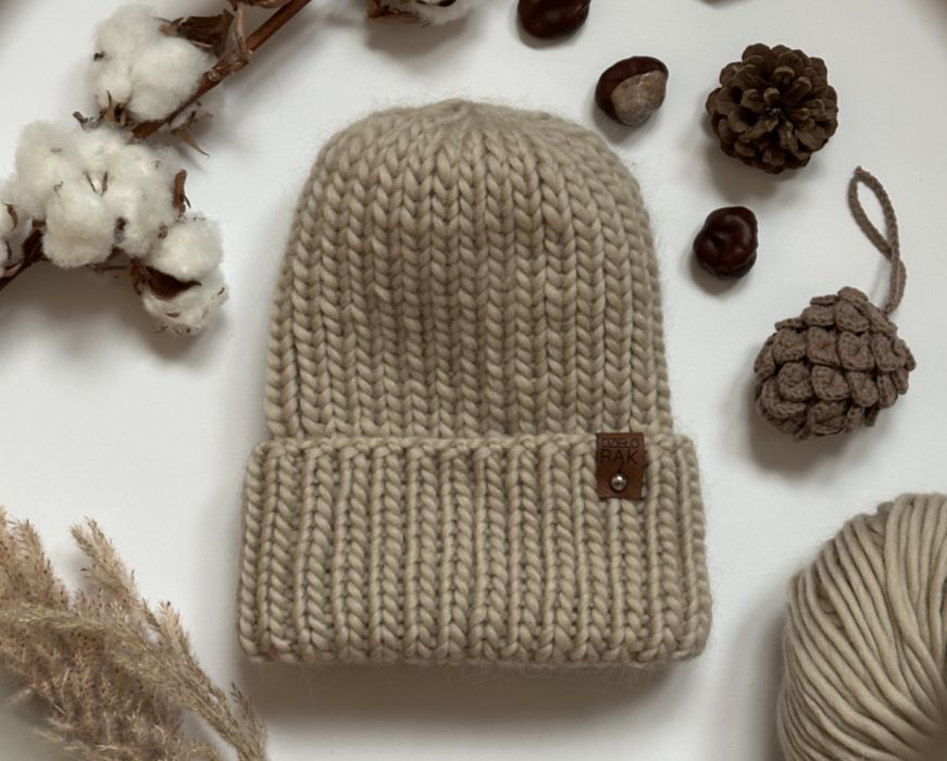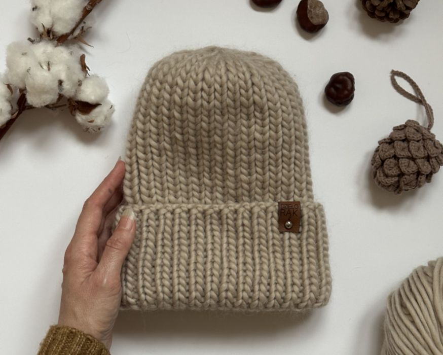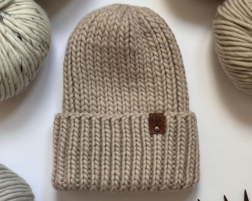 Ciepła czapka wydziergana na drutach z grubej, miękkiej i naturalnej 100% wełny peruwiańskiej wysokiej jakości.