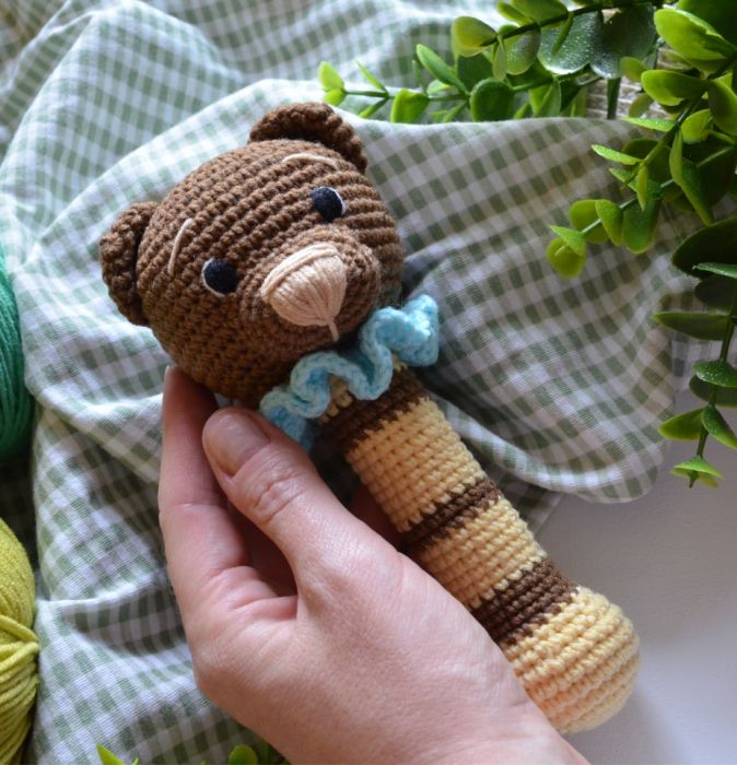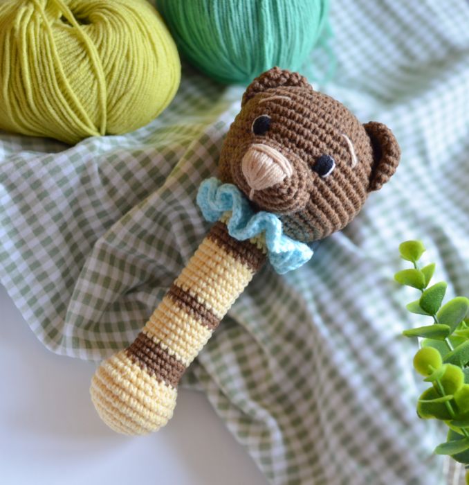Miękka grzechotka miś dla niemowląt jest szydełkowana z hipoalergicznej włóczki półbawełnianej.