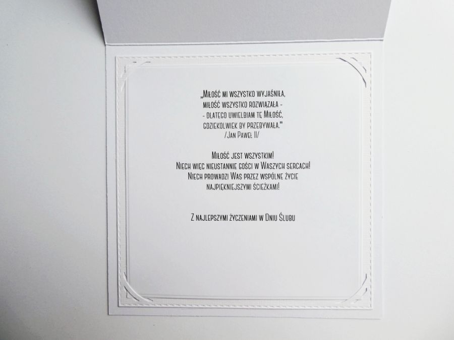 Kartka w pełni spełnia oczekiwania klienta. Elegancka, subtelna, wykonana z dbałością o szczegóły. Projektant uwzględnia wszystkie uwagi klienta. Gorąco polecam.