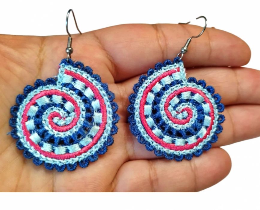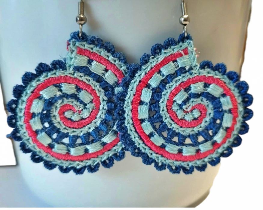 Kolczyki są haftowane (haft maszynowy). Haft jest gęsty, dobrze utrzymuje kształt i wygląd kolczyków. Haftowane kolczyki też są lekkie - to ich kolejny atut.