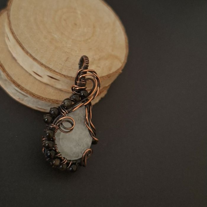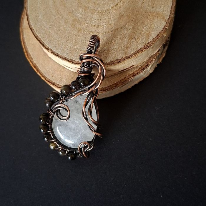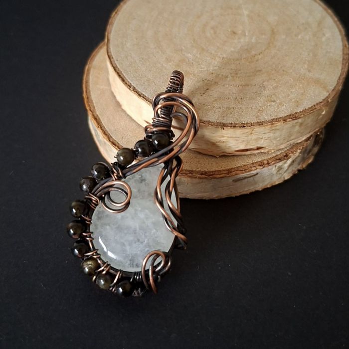 Ręcznie wykonany wisiorek. Jego serce to kwarc, a wokół obsydiany, oplecione oksydowaną miedzią.