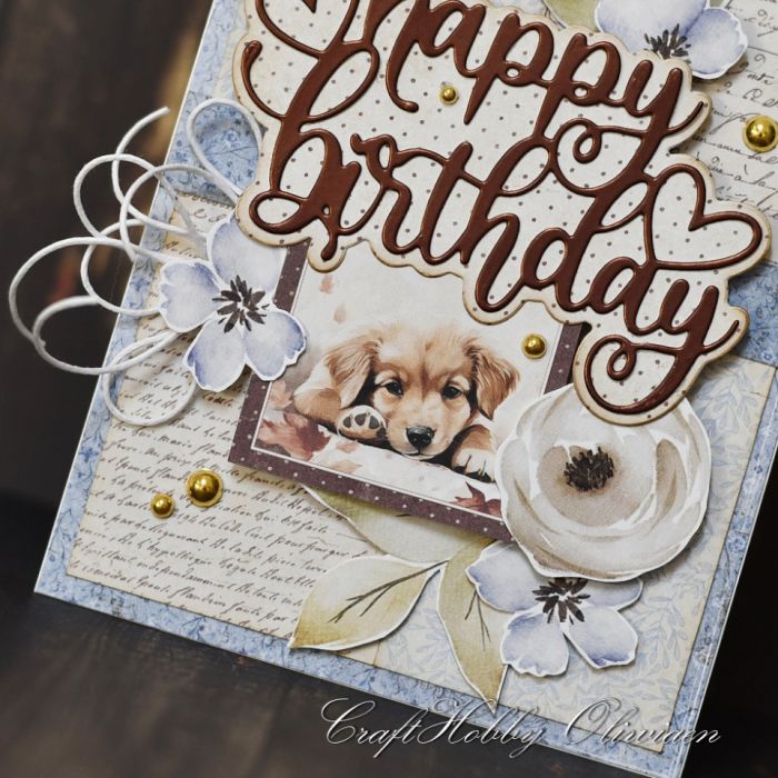 Wykonana z bezkwasowych papierów do scrapbookingu, ozdobiona motywami wyciętymi z papieru, w tym ryciną uroczego pieska, misternym napisem wyciętym w metalicznym kartonie, sznureczkiem i złotymi perełkami.