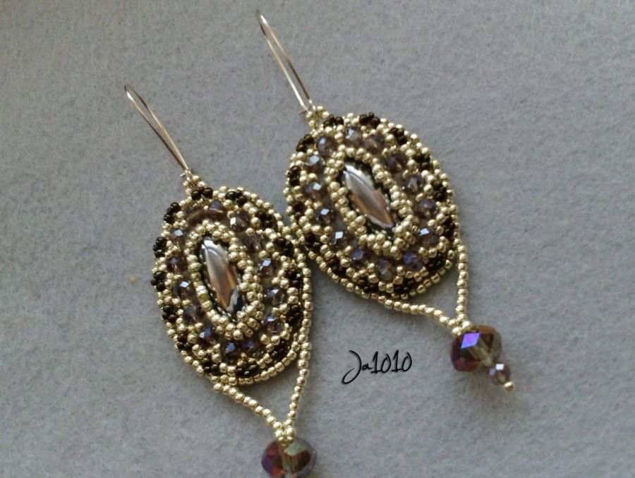 Kolczyki wykonane techniką haftu koralikowego. Materiały użyte to: drobne koraliki TOHO w kolorach Permanent Finish - Galvanized Aluminiumo oraz Metallic Iris Brown, szklane fasetowane oponki w kolorze dymnym opalizującym oraz hematytowe owalne kaboszony. Całość podszyta jest eco skórą. Kolczyki piękn0ie się błyszczą oraz mienią.