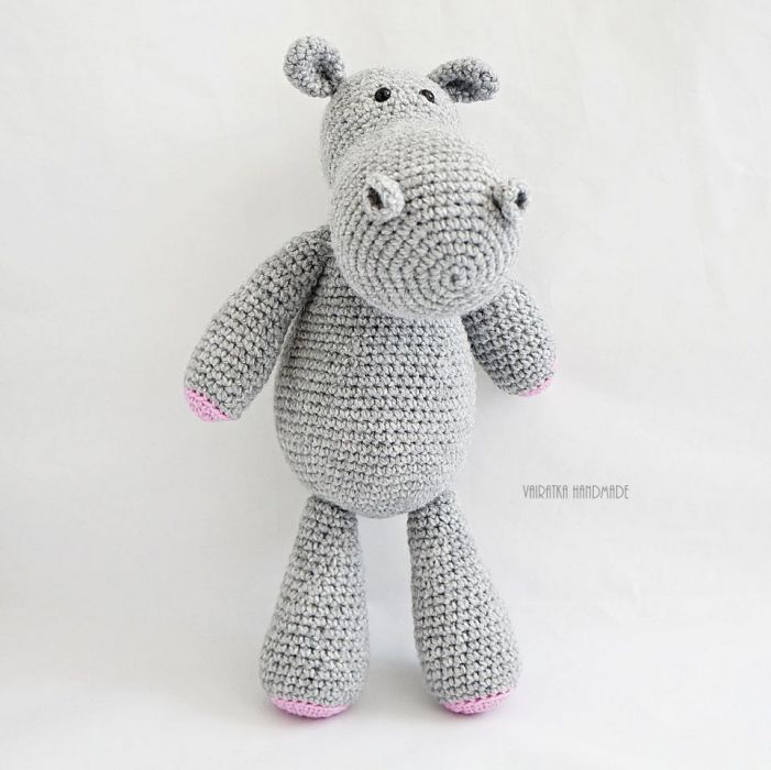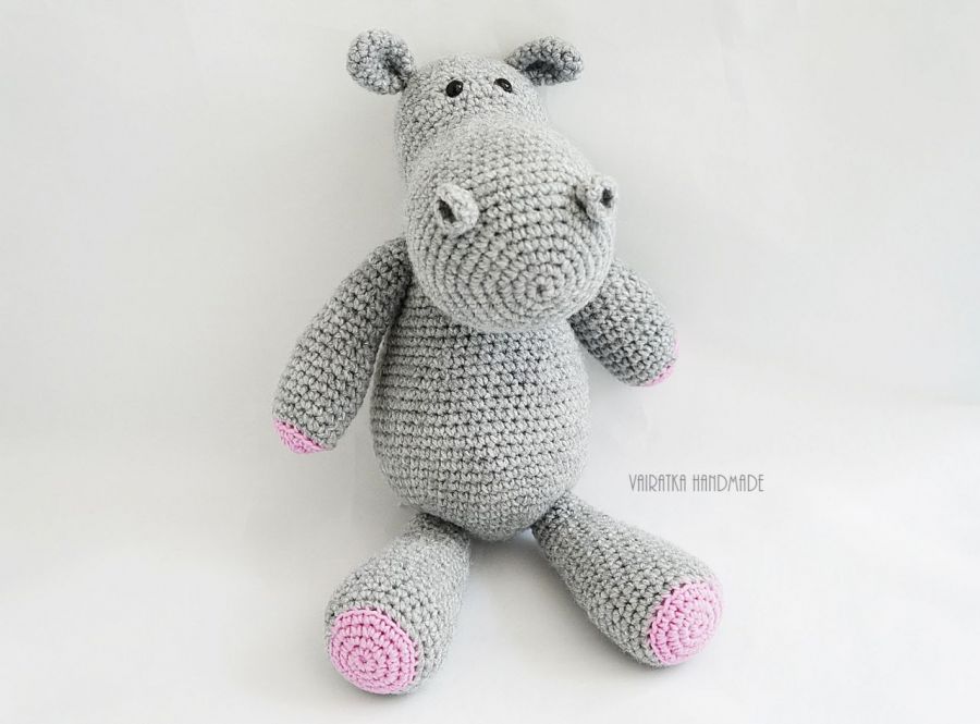 Hipopotam wydziergany na szydełku, z mięciutkiej włóczki akrylowej, wypełniony kulką silikonową. Posiada bezpieczne dla dziecka oczy - nie do wyjęcia.