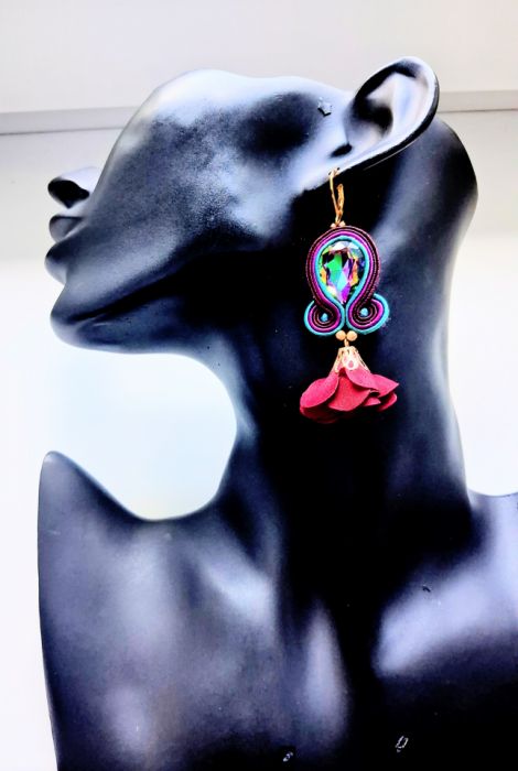 Kolczyki wykonane w modnej technice haftu sutaszowego. Jest ona pracochłonna, ale daje piękne efekty.
