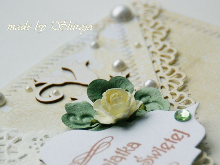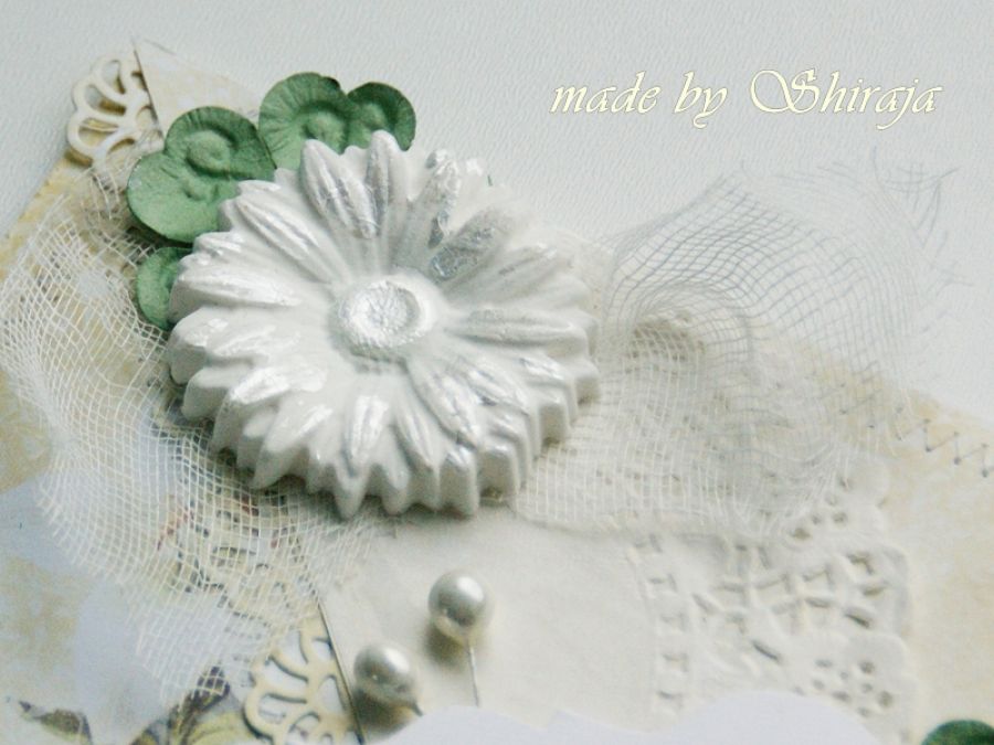 Elegancka i subtelna kartka w formie koperty. Ozdobiona wysokiej jakości papierami do scrapbookingu, obszywanymi maszynowo. Uroku dodaje pbiały kwiat wykonany ze specjalnej masy, oraz perełki W środku wkładka na życzenia, które mogę dodać wg. Państwa wytycznych.