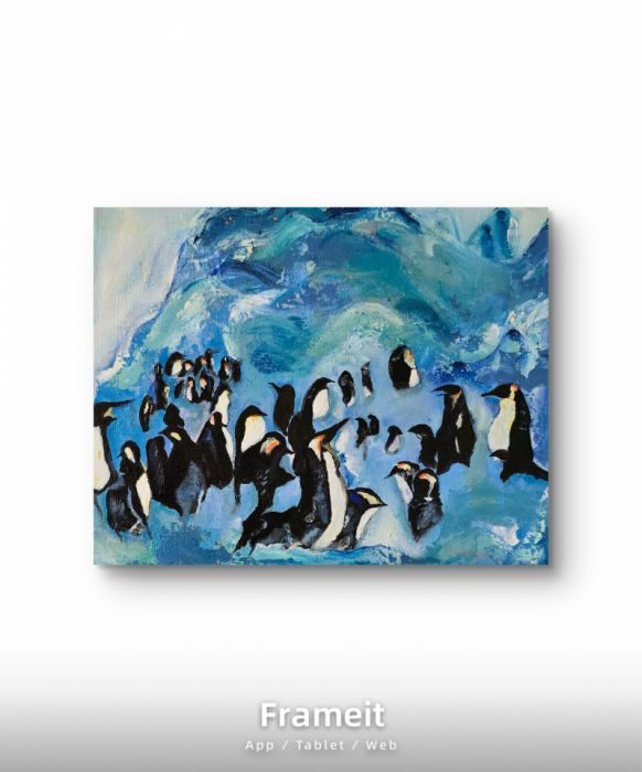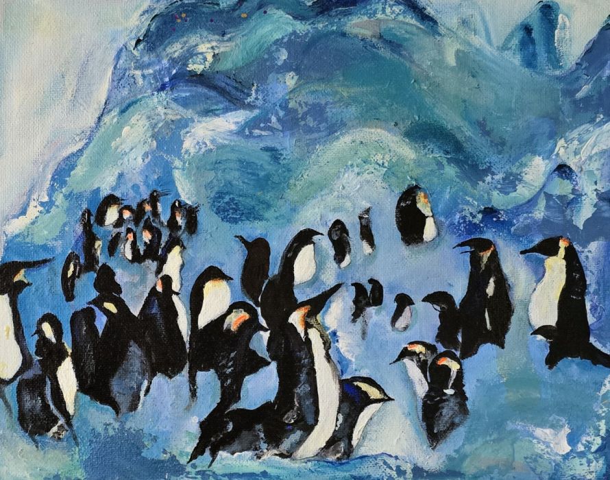 Obraz przedstawia pingwiny królewskie. Pingwiny królewskie żyją na subantarktycznych wyspach na północnych krańcach Antarktydy, a także na Tierra del Fuego, Falklandach i innych wyspach regionu o umiarkowanym klimacie. Pingwin królewski jest drugim co do wielkości pingwinem. Jest on czasami mylony z większym pingwinem cesarskim. Pomimo specyficznej nazwy „patagonicus”, pingwiny królewskie nie rozmnażają się już w Patagonii, ani w żadnej innej części Ameryki Południowej.