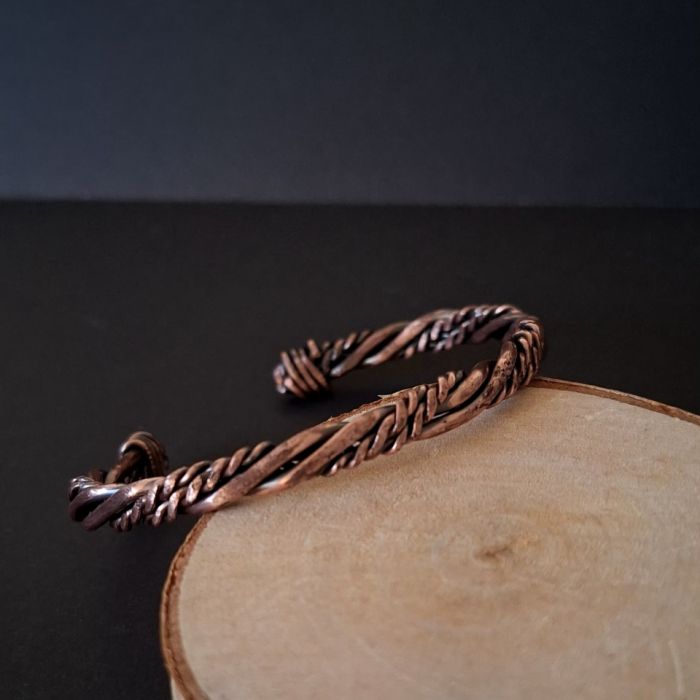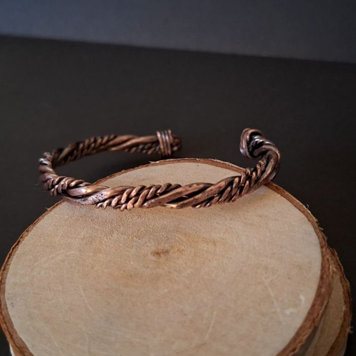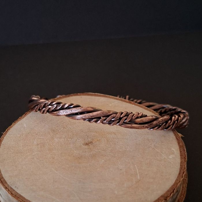 Delikatna ale wyrazista bransoletka damska. Ręcznie formowana w miedzi. Całość oksydowana i polerowana. Rozmiar regulowany