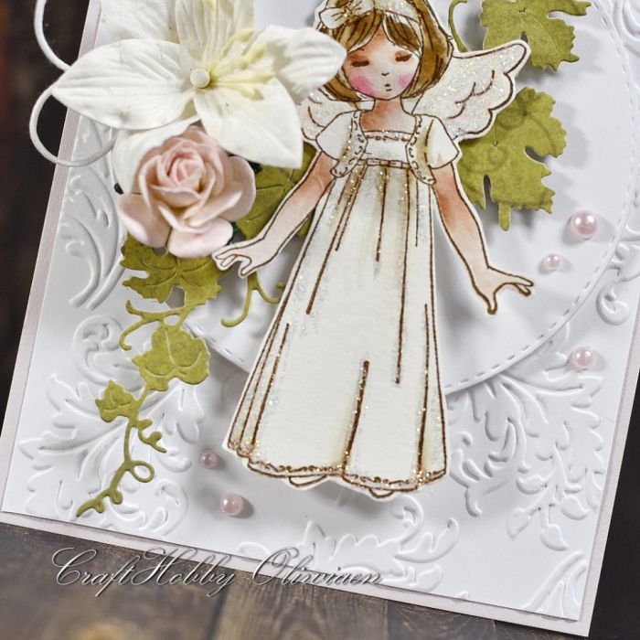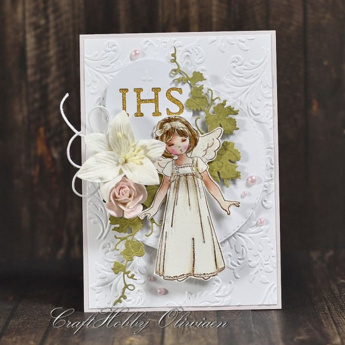 Wyjątkowa, oryginalna kartka z okazji I Komunii św. Kartka na bladoróżowej bazie, wykonana z bezkwasowych papierów do scrapbookingu, ozdobiona wytłaczanym tłem, stemplowanym i ręcznie kolorowanym motywem dziewczynki, warstwową Hostią, kompozycją kwiatową z wycinanymi pędami winorośli, różowymi perełkami i sznureczkiem.
