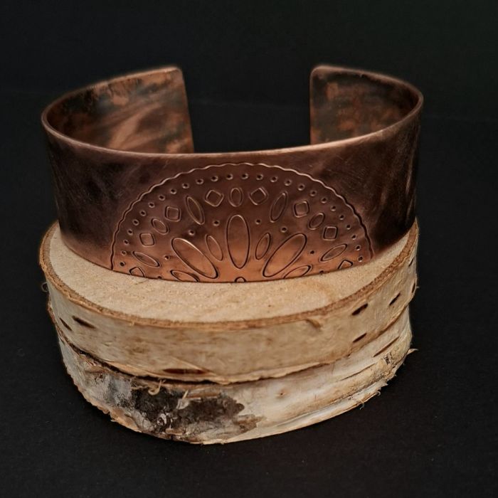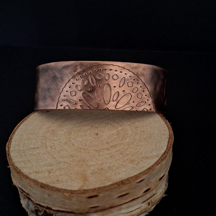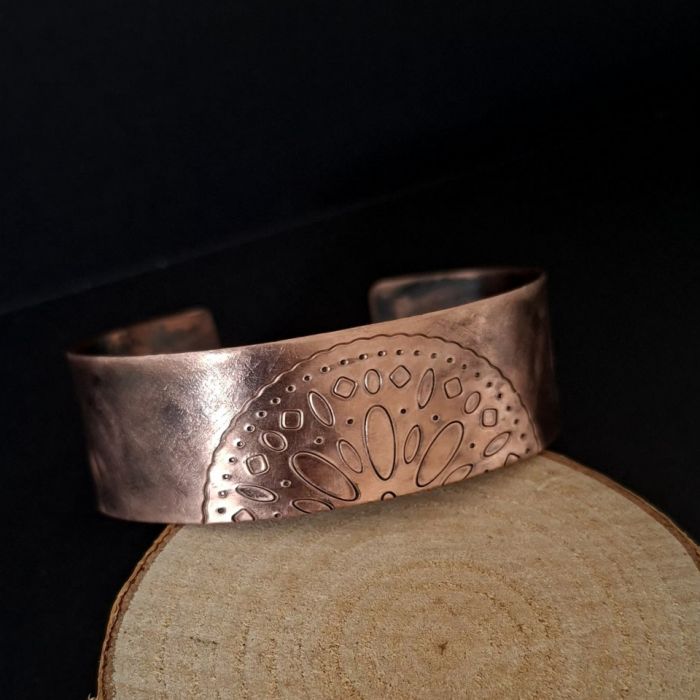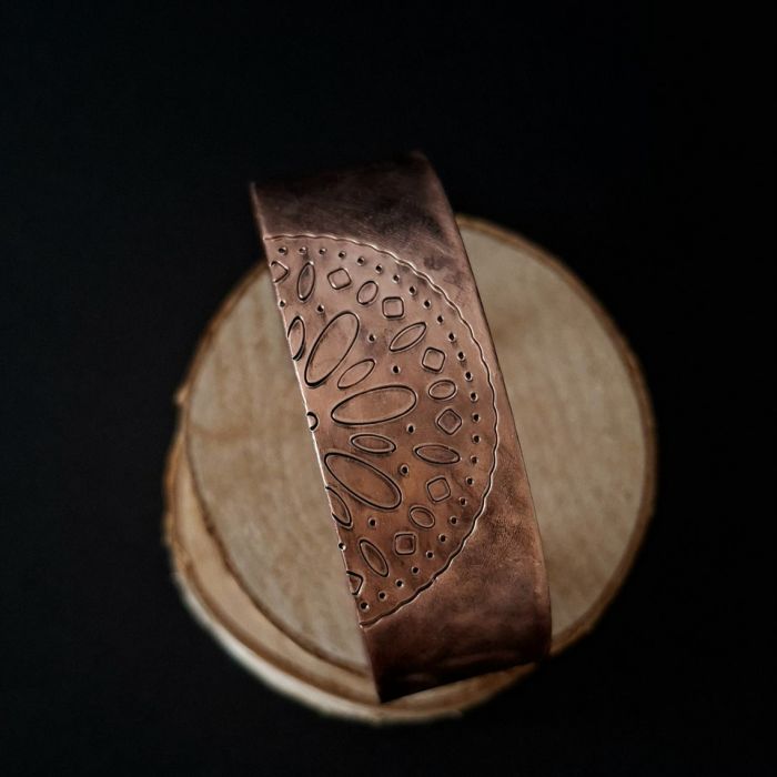 Miedziana bransoletka damska. Ręcznie kuta, formowana, oksydowana i polerowana. Delikatna ale wyrazista. Rozmiar regulowany.