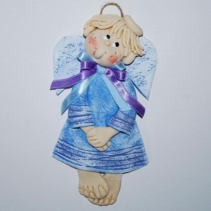 Anielski chłopiec - wykonany z masy solnej, termicznie utwardzanej, ręcznie malowany, z tyłu zabezpieczony lakierem i zapakowany ozdobnie w woreczek z celofanu. Wielkość, bez zawieszki (sznurek konopny),ok. 16 cm. Zapraszam