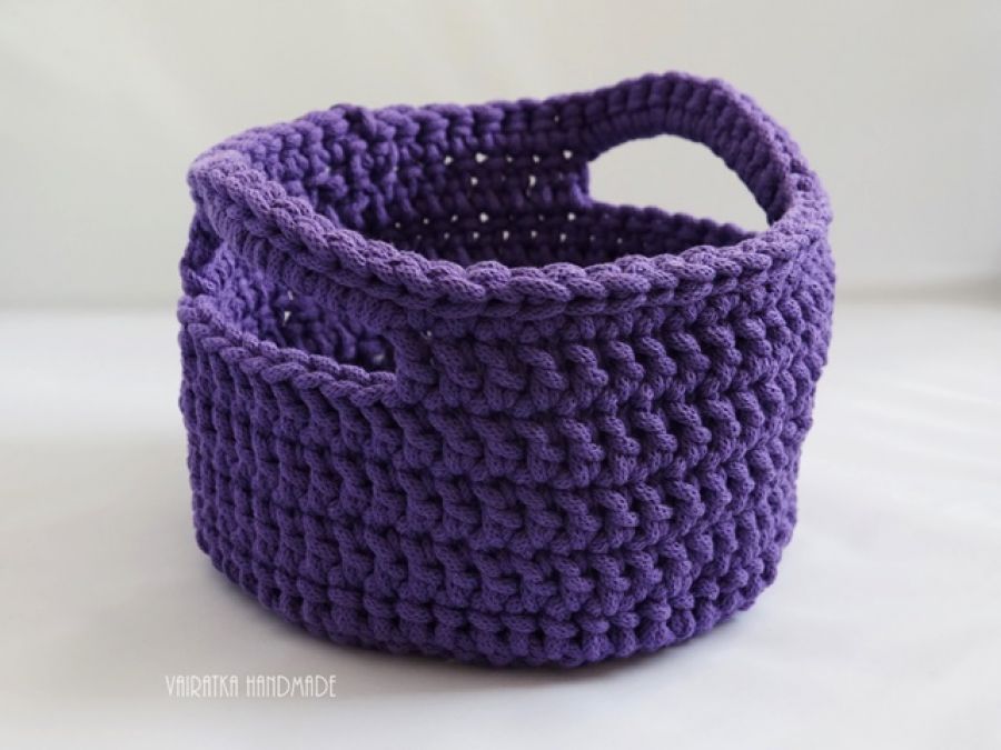 Okrągły koszyk z bawełnianego sznurka, wykonany na szydełku. Idealny do przechowywania przyborów łazienkowych lub drobiazgów w pokoju dziecięcym. Po bokach wygodne uchwyty.