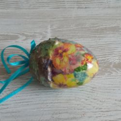 Styropianowe jajko, zdobione kolorowymi bratkami i masą strukturalną, w technice decoupagu. Malowane gesso i farbą akrylową. Dół jajka ostarzony za pomocą soli do patynowania,. Wielokrotnie lakierowane akrylowym lakierem z połyskiem. Może być piękną ozdobą stołu wielkanocnego, koszyczka czy stroika. Zaletą pisanki jest to, że jest nietłukąca. W domu gdzie są małe dzieci lub zwierzęta to duża zaleta. Podarowane w prezencie koleżance czy siostrze będzie atrakcyjnym upominkiem. Być może wzbudzi zainteresowanie rękodziełem artystycznym.
