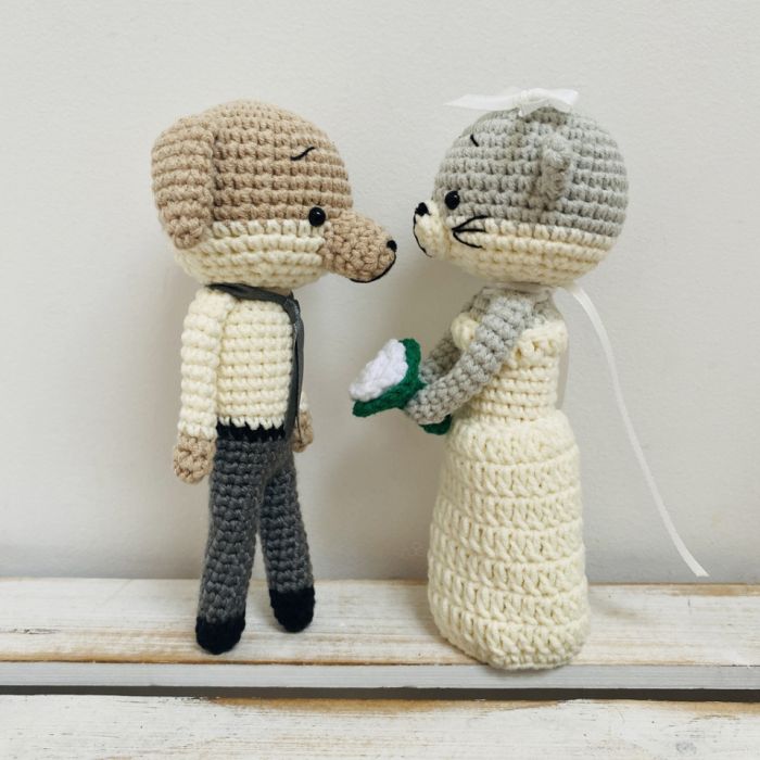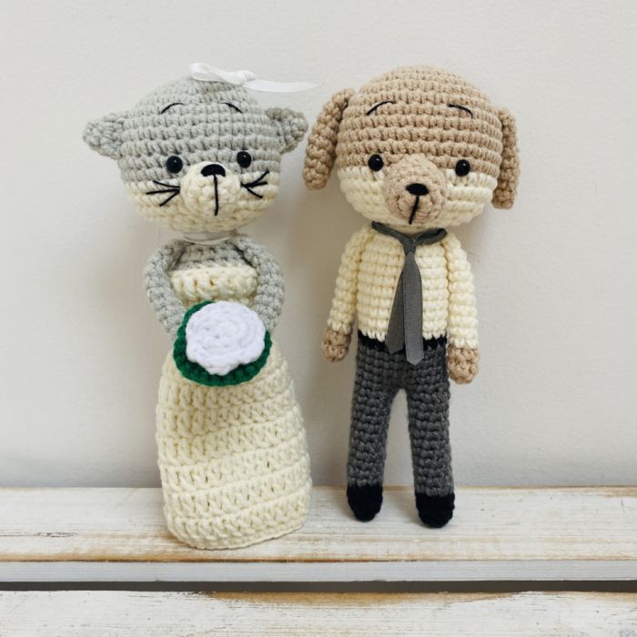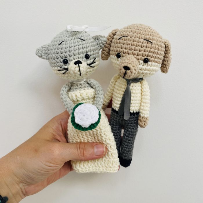Młoda Para - kot i pies maskotki, wykonane ręcznie na szydełku z wysokiej jakości bawełny i akrylu anti-pilling (niemechacący się) z certyfikatem OEKO-TEX Standard 100, wypełnione antyalergicznym wkładem poduszkowym.