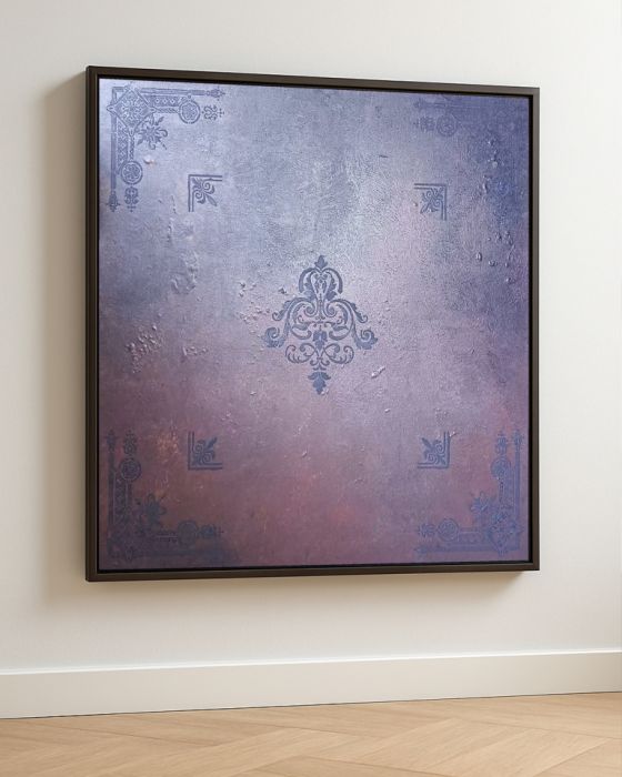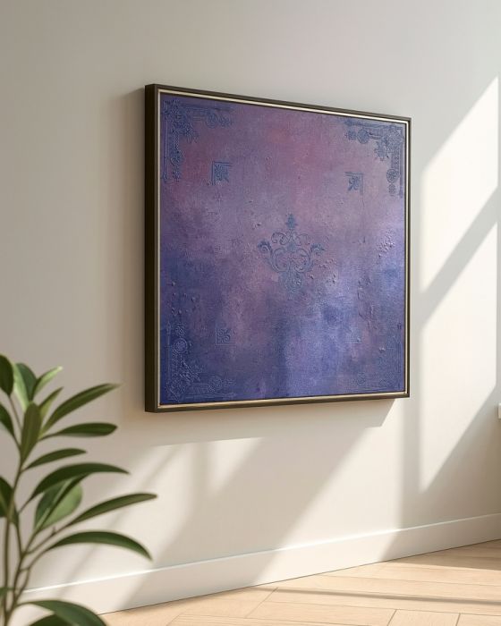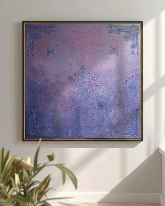 "Jak Śliwka w Kompot" to obraz, który lubi zaskakiwać. W zależności od kąta padania światła ujawnia różne osobowości — od głębokiego granatu, przez fiolet, aż po ciepłe bordo. Nigdy nie wygląda tak samo dwa razy, jakby co chwilę zakładał nową szatę. W tle można dostrzec delikatne ornamenty o orientalnym zacięciu – trochę jak perskie wzory, trochę jak egzotyczna pocztówka. Nie wychodzą na pierwszy plan, raczej mrugają okiem do widza i dodają całości lekko tajemniczego klimatu.