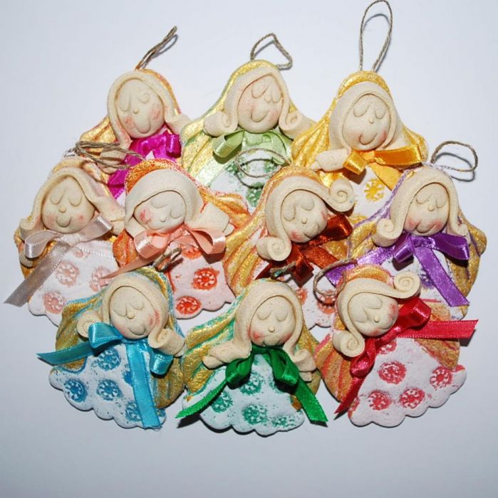 Aniołki na każdą okazję, także nieprzeciętny upominek dla naszych gości. Mogą stać się ozdobą naszego domu i być atrakcyjną świąteczną dekoracją. Wykonane jest z masy solnej, termicznie utwardzane, malowane i lakierowane. Wielkość, bez zawieszki, ok 8 cm. Komplet - 10 szt.