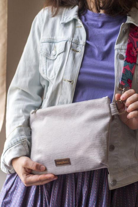 Zadaj pytanie dotyczące produktu: Jasnoszara kopertówka na kolorowym pasku