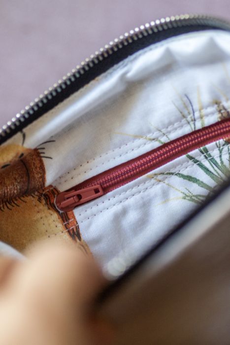 Małe zaszewki na dnie. Z tyłu oraz w środku torebki kieszonki zapinane na suwak. Środek wykończony białą bawełnianą podszewką w kapibary.
