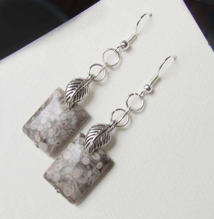 Zachwycające jaspisy w odcieniach szarości przełamanej stonowanymi barwami we wzorze. Swobodnie obracające się i kołyszące na drucikach, ozdobione -równie swobodnie listeczkami o ładnej formie. Wymiary kamienia: 2cm x 1,5 cm.