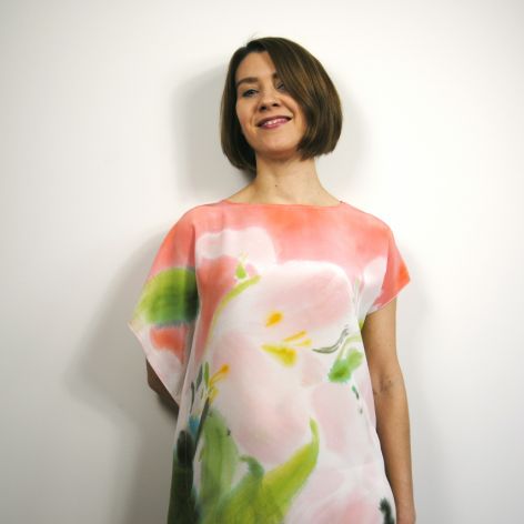 Bluzka wykonana jest z ręcznie malowanej krepy jedwabnej w odcieniach brzoskwini, błękitu, delikatnego różu i szarości. Krepa jedwabna to materiał, który wspaniale nadaje się na wiosenne spacery, letnie gorące i długie wieczory. Wspaniale otula. Jest miękki, przyjemny i oddychający. Bluzka jedyna w swoim rodzaju pozwala czuć się komfortowo a przy tym jednocześnie wyjątkowo i elegancko.