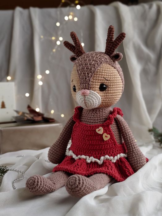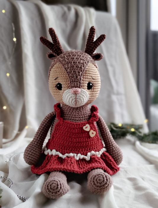 Miękka zabawka jeleń w sukience będzie uroczym prezentem dla dziewczynek na wiele różnych okazji. Może również służyć jako dekoracja do pokoju dziecięcym.