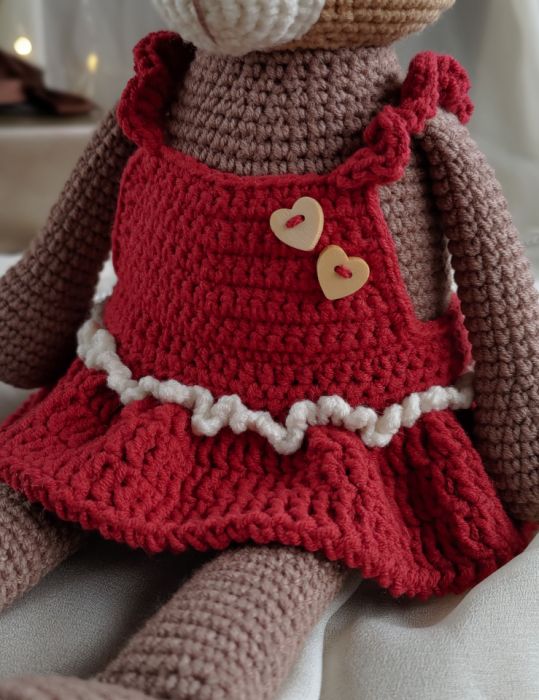 • Zabawka jest ubrana w odpinaną sukienkę w kolorze winnym z mlecznym paskiem.