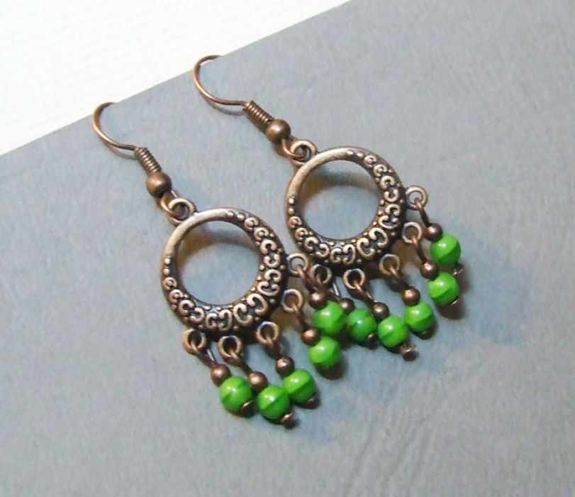 Kolczyki wykonane z miedzi, z koralikami zielonymi.