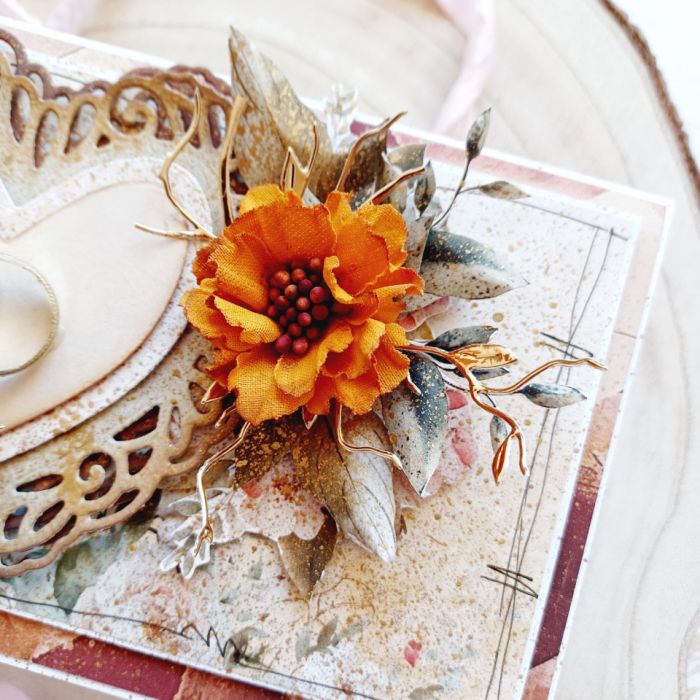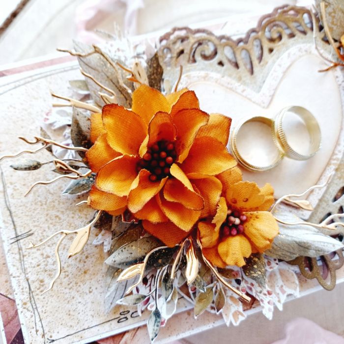 Przedstawiam ręcznie robioną kartkę okolicznościową o podłużnym formacie, idealną na jesienny ślub lub rocznicę. Kompozycja zachwyca ciepłymi, głębokimi odcieniami palonej pomarańczy, brązów i złota, doskonale oddając urok jesieni. Centralnym elementem jest ażurowe serce oraz przestrzenny motyw obrączek, symbolizujących trwałe uczucie. Ekskluzywna kartka wykonana techniką scrapbooking posiada bogate zdobienia 3D z ręcznie formowanych kwiatów i listków. Unikalne rękodzieło dostępne na Artillo.