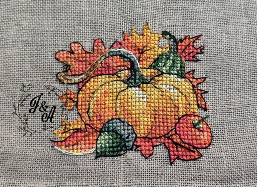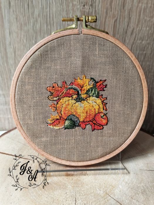 Ten ręcznie wykonany obrazek powstał przy użyciu tradycyjnej techniki haftu krzyżykowego. Misternie wyszyty na lnianej tkaninie drobnymi krzyżykami, wykorzystuje aż 16 odcieni kolorowych mulin, tworząc bogaty i szczegółowy wzór jesiennej dyni.