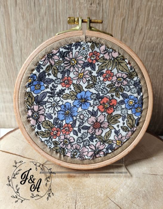 Materiały: lniana tkanina, kolorowe bawełniane muliny firmy DCM i oprawa z drewna bukowego, bawełniany ozdobny materiał w kwiatki, obrazek ma metalowy uchwyt z gwoździem, stojak uniwersalny z pleksi