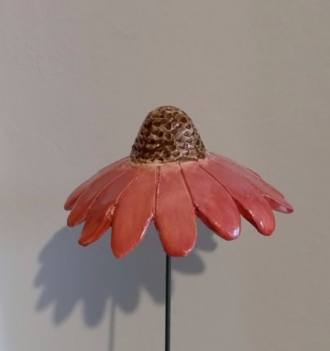 Ceramiczna jeżówka ręcznie lepiona, mała, zamontowana na metalowym drucie florystycznym i średnicy 1,8 mm, dzięki temu można dostosować długość łodygi (standardowo 40 cm) i wygięcie. Pięknie prezentuje się w większym bukiecie