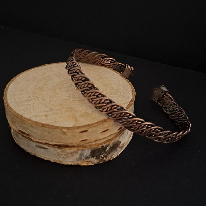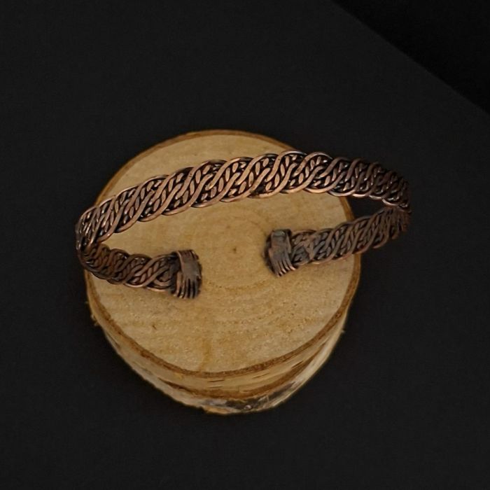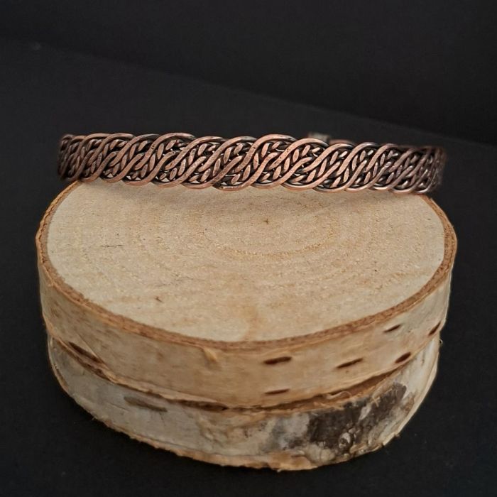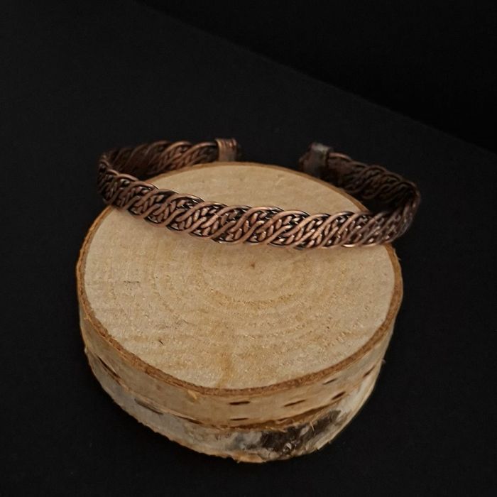 Ręcznie wypleciona z miedzi bransoleta męska. Wielkość regulowana, zatem odpowiednia na większość nadgarstków. Ręcznie pleciona, oksydowana i polerowana. Szerokość około 1 cm.