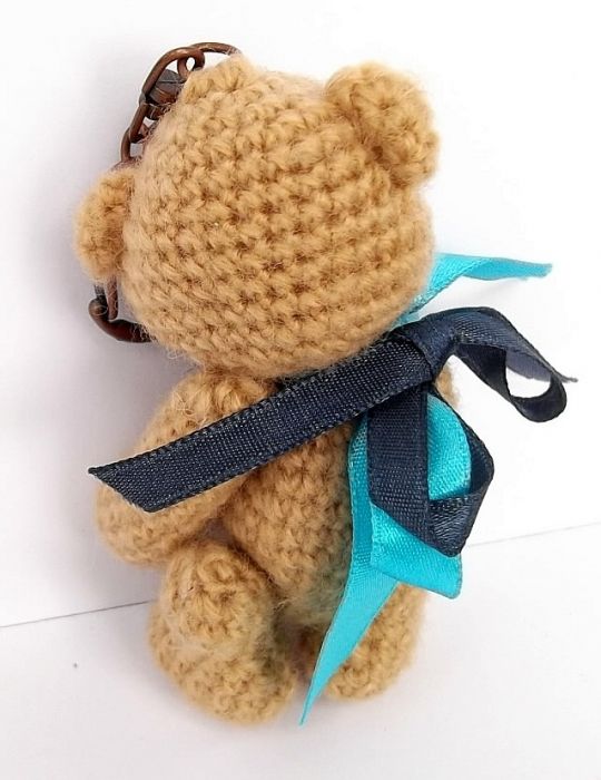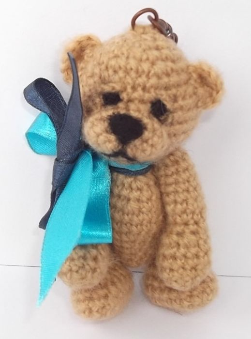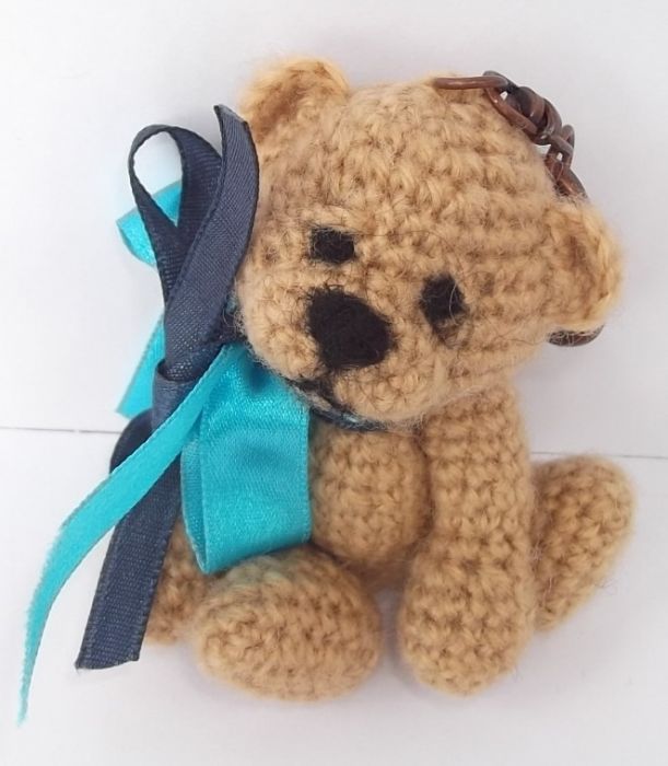 Miś wykonany z włóczki na szydełku, wypełniony włókniną. Wzrost (bez zawieszki) 9cm.