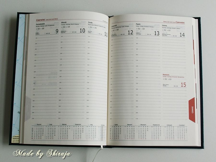 Format A5, tydzień na dwóch stronach. Zapakowany w przeźroczystą folijkę ochronną.