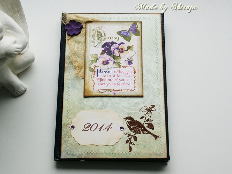 Kalendarz książkowy na rok 2014, ozdobiony papierami do scrapbookingu, obszywany maszynowo.