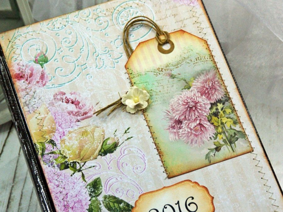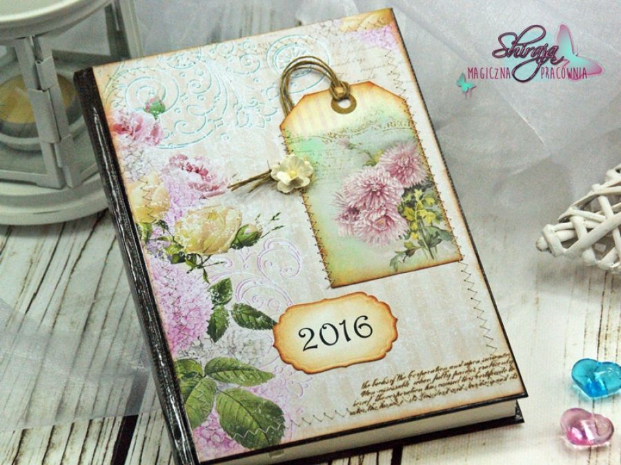Kalendarz książkowy na rok 2016, ozdobiony papierami do scrapbookingu, obszywany maszynowo.
