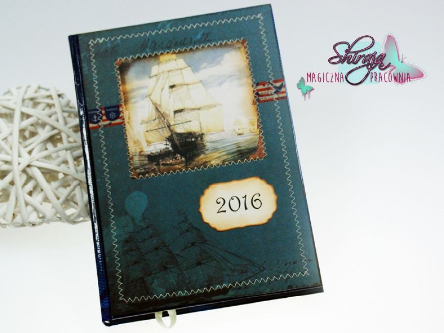 Kalendarz książkowy na rok 2016, ozdobiony papierami do scrapbookingu, obszywany maszynowo.