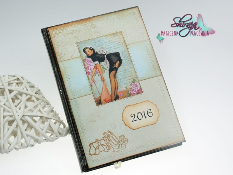 Kalendarz książkowy na rok 2016, ozdobiony papierami do scrapbookingu, obszywany maszynowo.