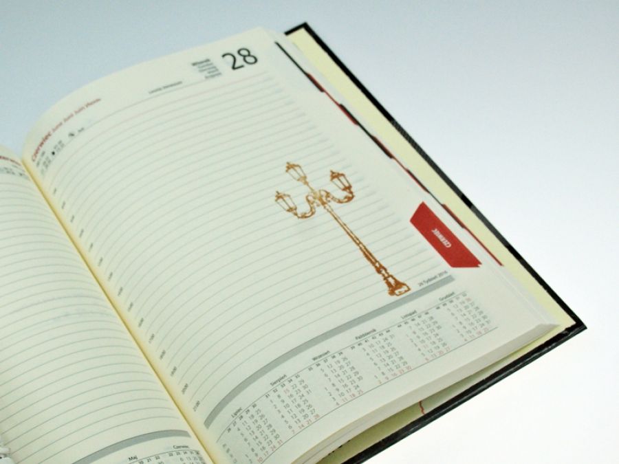 Format A5. Układ: jeden dzień na stronę, niektóre stemplowane. Zapakowany w przeźroczystą folię ochronną.