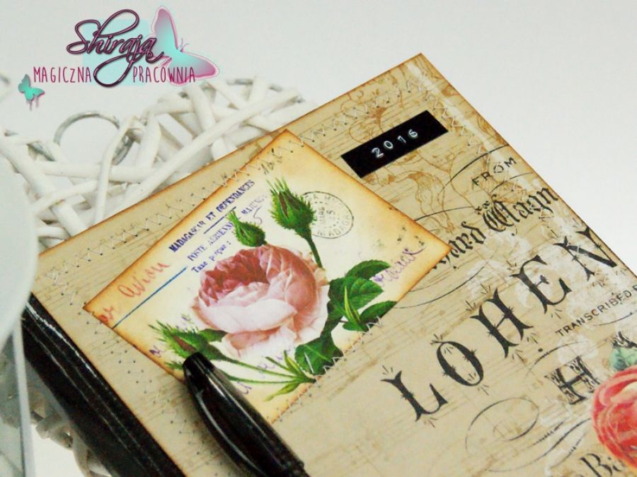 Kalendarz książkowy na rok 2016, ozdobiony papierami do scrapbookingu, obszywany maszynowo.