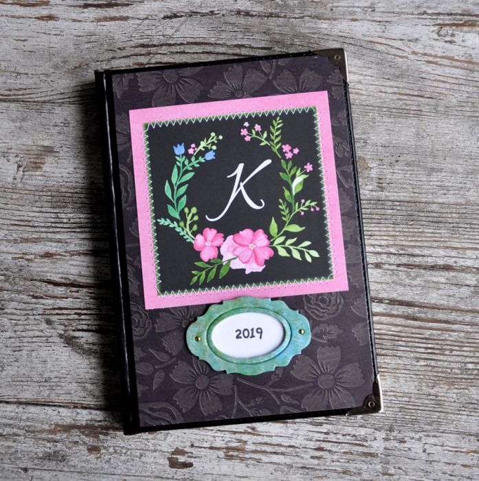 Piękny i wyjątkowy kalendarz książkowy z monogramem -na nowy rok- 2019; układ dzienny, rozmiar A5; ozdobiony metodą scrapbookingu; przeszywany maszynowo; może stanowić oryginalny prezent; zapraszam