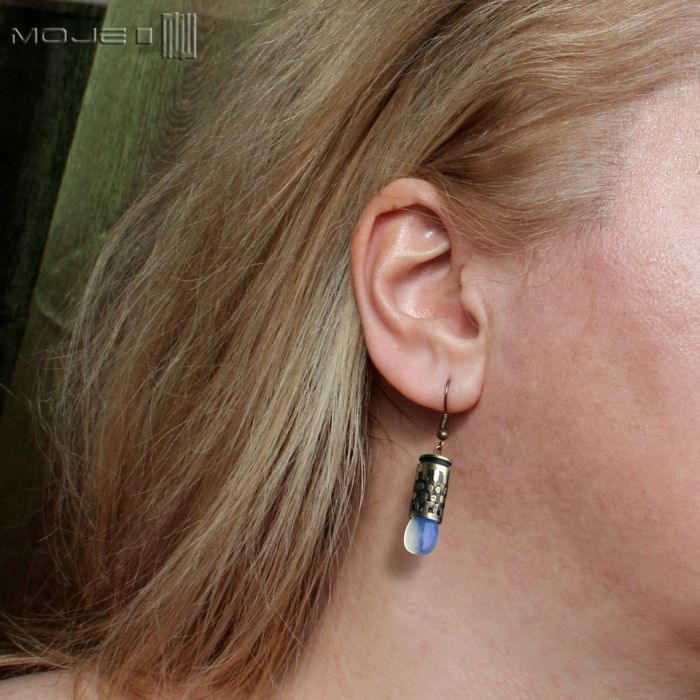 Kolczyki, które powstały z mosiężnych łusek, które wytrawiłam i spatynowałam. Ozdobą są krople opalu - balansujące w kolorze pomiędzy bladomiodowym a bladoniebieski (jak to opal). Zawieszone na metalowych biglach w kolorze mosiężnym.