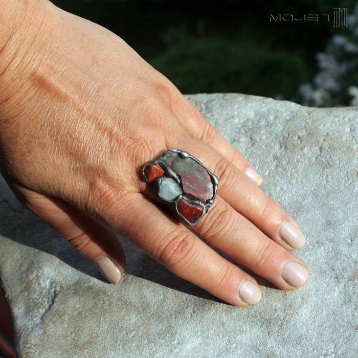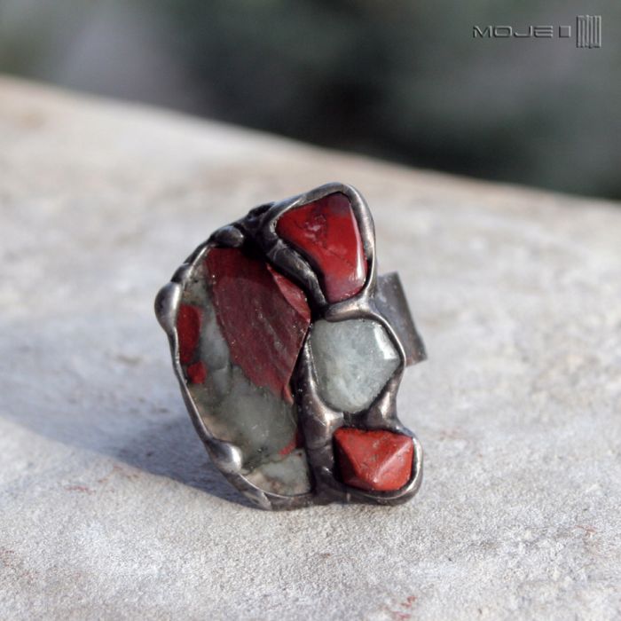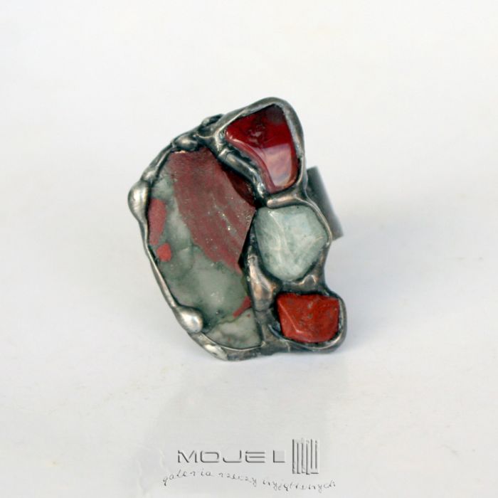 Pierścionek z kamieni i miedzi - surowy jaspis wulkan w szaro-zielono-czerwonej barwie oraz dwa kolejne to chyba karneol i agat... Całość oprawiona i wykończona miedzią pokrytą cyną, patynowaną i przecieraną.